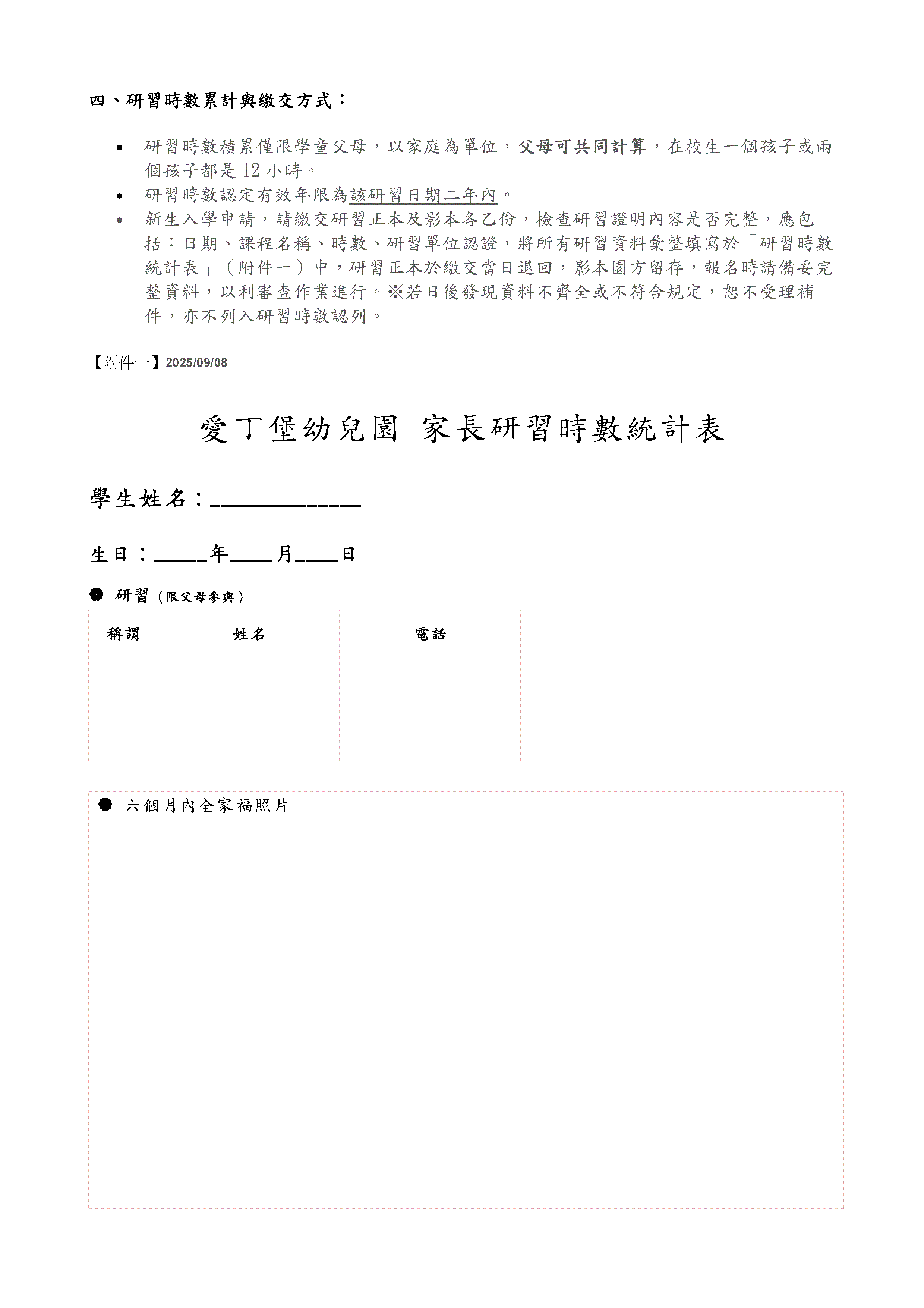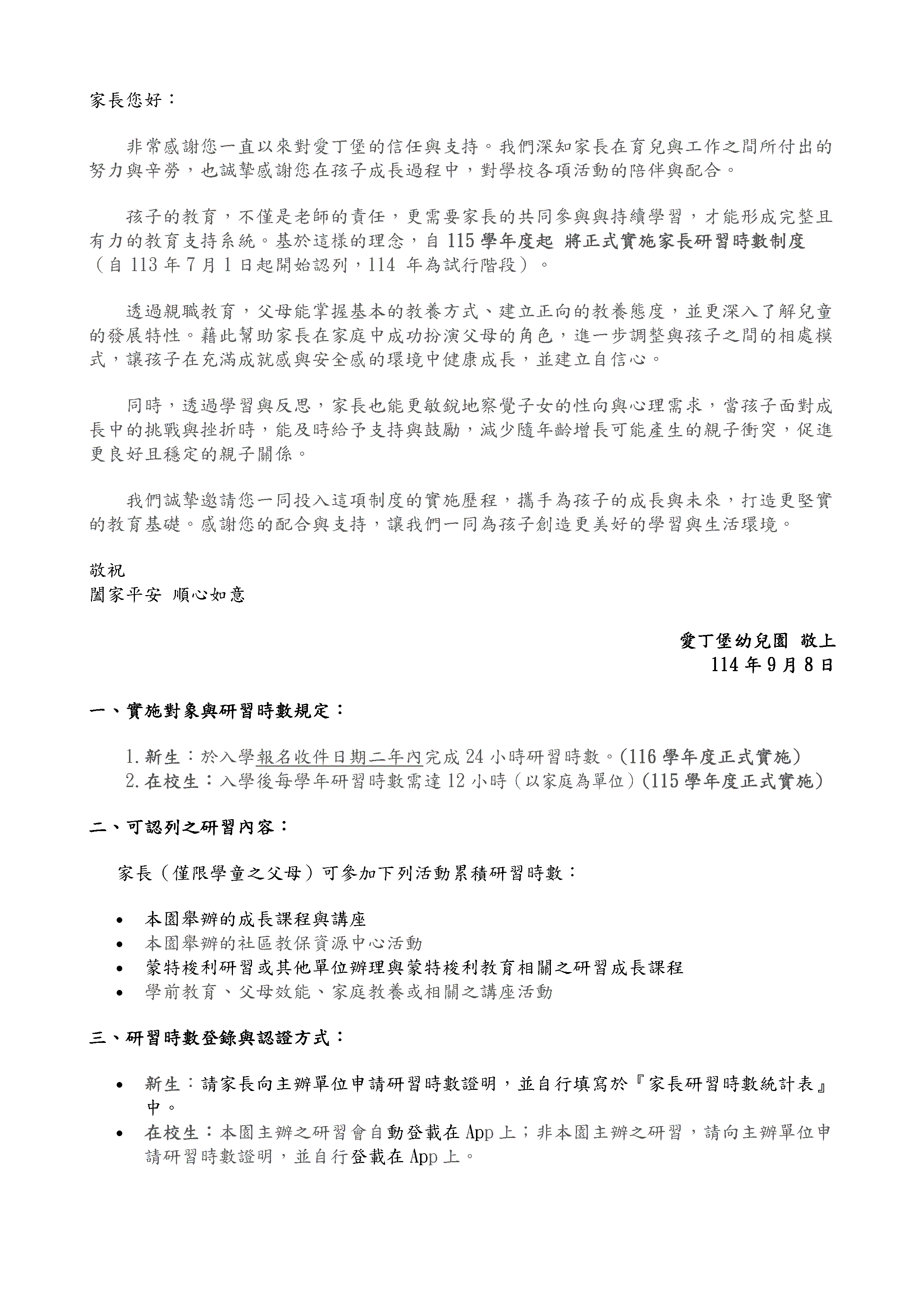 自115學年度起,「愛丁堡準公共幼兒園」將正式實施『家長研習時數計畫』, 旨在透過親職教育,提升家長對教養的理解與支持, 建立正向的教養態度,並促進親子關係的和諧與孩子的全面成長。 若您的孩子計畫於115學年度起就讀「愛丁堡準公共幼兒園」, 請留意有關實施辦法,並詳閱相關計畫內容,確保符合資格。 感謝您的配合與支持!
